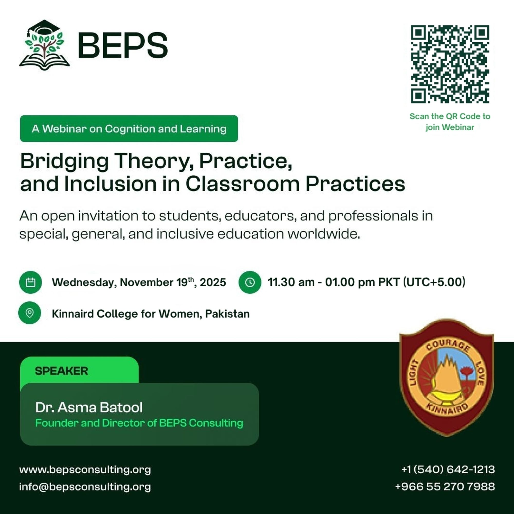 Join us for an insightful session on "Bridging Theory, Practice, and Inclusion in Classroom Practices" led by renowned expert Dr. Asma Batool, Founder and Director of BEPS Consulting.